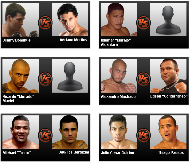 O card da competição prevê nove lutas, sendo duas disputas de cinturão e três delas duelos entre brasileiros e estrangeiros. Nos dois principais combates da noite, o manaura Adriano Martins colocará o título da categoria até 70kg em jogo contra o americano Jimmy Donahue, enquanto o campeão da divisão até 93kg, Kleber Orgulho ficara frente a frente com Aldo Sultão.