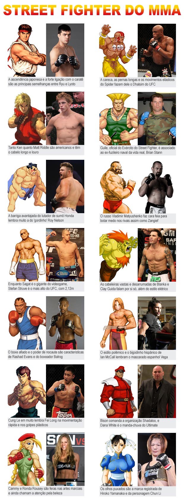 Além dessas semelhanças que o MMA tem com qualquer jogo de luta pode ser percebido semelhanças físicas entre lutadores reais com lutadores do Street Fighter.