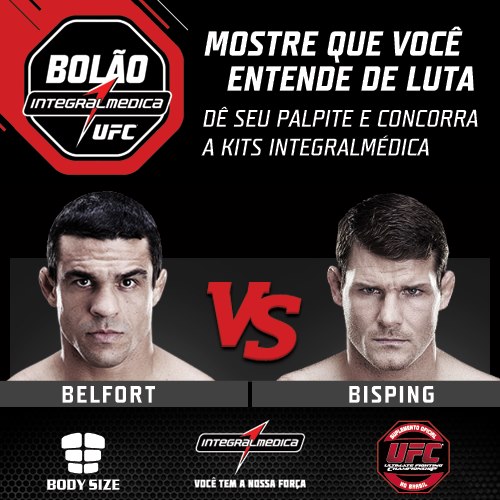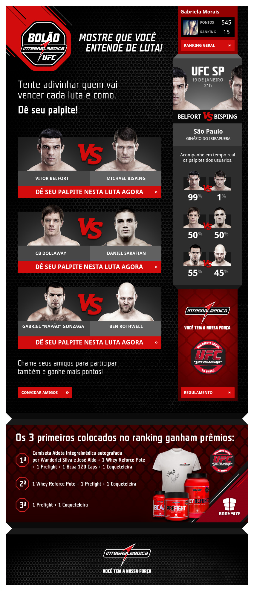 Patrocinadora oficial do Ultimate Fighting Championship no Brasil, a Integralmédica Suplementos Nutricionais lança o segundo Bolão Integralmédica UFC, para testar os conhecimentos de MMA dos fãs brasileiros. O primeiro Bolão foi um grande sucesso e recebeu mais de mil palpites sobre as principais lutas do UFC Rio III, além de ter distribuído amostras grátis de ISO whey protein e Mycellar para os 200 primeiros participantes.
