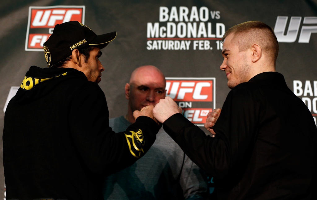 Renan Barão, campeão interino dos pesos galos, defenderá pela primeira vez o seu cinturão e garante estar focado no seu trabalho, sem pensar muito no futuro da categoria. “Eu acho que não é vantagem ter mais experiência e ter protagonizado mais eventos que ele (McDonald). Eu estou focado e 100% para esse luta”. Quando perguntado sobre o que pode acontecer caso ele vença e o americano Dominick Cruz continue lesionado, ele respondeu que irá acatar o que o evento decidir: “Isso quem vai decidir é o UFC. Sou um empregado e faço o que a organização pedir. Quero muito enfrenta-lo, mas se o UFC optar por colocar outro na minha frente, tudo bem”.