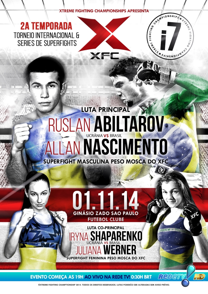 O XFC International chega à sua sétima edição, no dia 1º de novembro, no ginásio do São Paulo Futebol Clube, na capital paulista, com quatro grandes confrontos no card principal, transmitidos ao vivo pela RedeTV! a partir de 0h30 de sábado para domingo. Na luta principal da noite, Allan Puro Osso, uma das principais revelações do MMA nacional, encara o ucraniano Ruslan Abiltarov em duelo válido pela categoria peso-mosca (até 56,7kg). Na co-luta principal, uma superluta feminina peso-palha (até 52,2kg), entre Julie Werner e a também ucraniana Iryna Shaparenko, de apenas 19 anos. O duelo entre Liana Ferreira Pirosin e a colombiana Marcela Yineris, válido pelas quartas-de-final do torneio da mesma categoria, também acontece no card principal. O quarto embate ao vivo e as informações sobre ingressos serão anunciadas em breve.