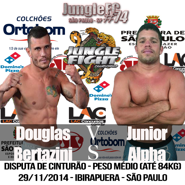 O duelo principal do Jungle Fight 74, marcado para o dia 29 de novembro, no ginásio do Ibirapuera, em São Paulo, será entre o paulista Douglas Bertazini e o baiano Júnior Alpha. O combate colocará em jogo o cinturão dos pesos-médios (até 84kg) da organização, vago desde a ida de Ildemar Marajó para o UFC. O restante das lutas do card serão anunciadas em breve.