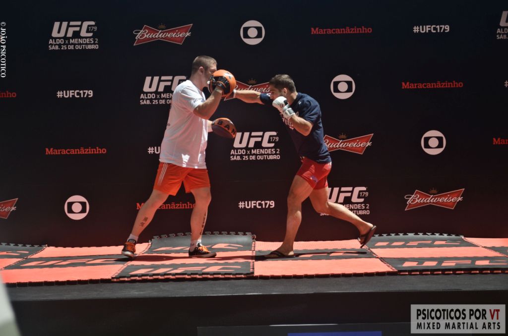 Após os treinos e entrevistas dos três primeiros, Glover Teixeira e Phil Davis subiram ao palco para a primeira encarada seguida de exibições de golpes e movimentos. O campeão José Aldo e o desafiante Chad Mendes se encararam e treinaram na sequência para delírio dos fãs presentes.