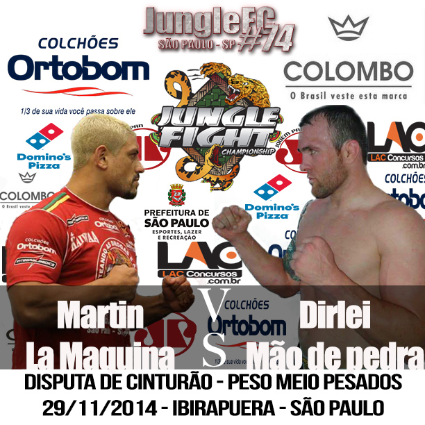 A próxima edição do Jungle Fight promete ser uma das melhores do ano, com duas disputas de cinturões na mesma noite. Valendo o título dos meio-pesados (até 93kg), o brasileiro Dirlei “Mão de Pedra” encara o argentino Martin “La Maquina”, na luta principal do card. Já no co-evento o paulista Douglas Bertazini disputa o cinturão dos pesos-médios (até 84kg) contra o baiano Júnior Alpha.