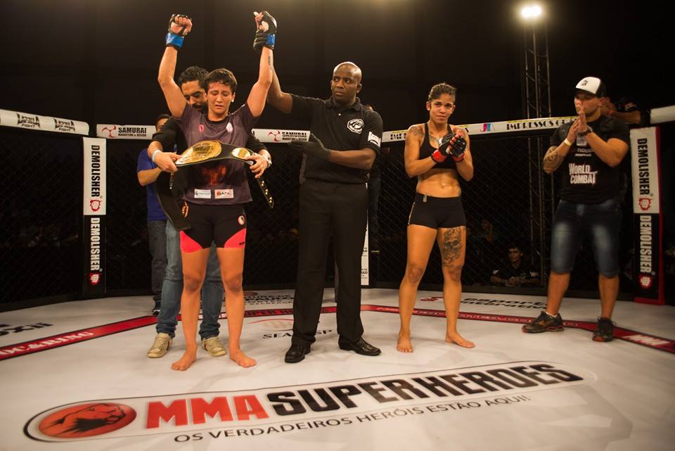 Já o co main event da noite, Camila “Pitbull” e Virna Jandiroba chegaram pra disputar uma semifinal, mas foram obrigadas a disputarem logo de cara a grande final, já que a outra atleta do torneio, Marilia “Chocolate” não atingiu o limite da categoria na pesagem e foi desclassificada mesmo vencendo Aline Sattelmayer por decisão majoritária na abertura do card principal. Sabendo que o duelo seria de 5 rounds, a baiana Virna Jandiroba e a paulista Camila “Pitbull” partiram pro tudo ou nada e não queriam saber de ir até o final. Com um jiu-jitsu de primeira, Virna não deu chances a Camila e encaixou um justo mata-leão aos 4 minutos e meio do segundo round e levou pra Bahia o cinturão do torneio peso palha do MMA Super Heroes para Bahia.