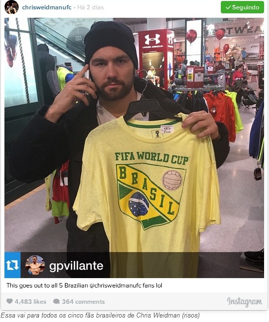 Com 12 vitórias na carreira, sendo cinco delas em cima de brasileiros, o norte-americano Chris Weidman resolveu provocar os lutadores do país. Por meio de suas redes sociais, o campeão dos médios postou uma foto segurando uma camiseta referente à Copa do Mundo no Brasil, com uma legenda alfinetando não apenas os atletas que venceu, como seu próximo desafiante ao cinturão, Vitor Belfort.