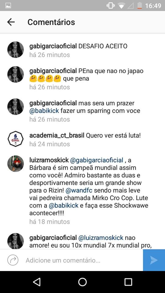 2 Publicado 5 de outubro de 2016 at 540 × 960 in Barbara Nepomuceno lança desafio a Gabi Garcia em luta pelo Rizin FC “Quero lutar com você !” ← Anterior Próxima → COMPARTILHE NAS REDES SOCIAIS:Tweet Envie um link por e-mail para um amigo(abre em nova janela) E-mail Compartilhar em Vimeo(abre em nova janela) Vimeo Imprimir(abre em nova janela) Imprimir Compartilhar no Telegram(abre em nova janela) Telegram Compartilhar no WhatsApp(abre em nova janela) WhatsApp Curtir Carregando...