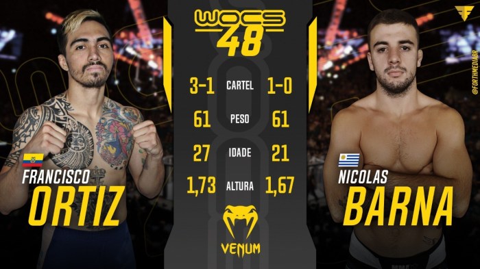 Uma luta que promete atrair os olhares não só da torcida brasileira como também de nossos vizinhos sulamericanos, é o combate internacional entre o equatoriano Francisco “Isco” Ortiz e o uruguaio Nicolas Barna. Isco, atleta que tem como seu carro chefe o Sambo, vem treinando no Brasil pela Tatá Fight Team, dos mestres Tatá Duarte e Phillip Lima. Já seu adversário Barna é mais uma joia uruguaia da Baixinho Team. Ambos farão a última luta do card preliminar e prometem levantar o público presente no Hotel Laghetto Stilo.