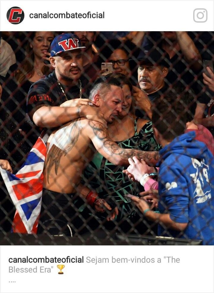 Após a vitória, um emocionado Holloway pulou a grade do octógono, quebrando o protocolo para comemorar abraçando seus familiares.