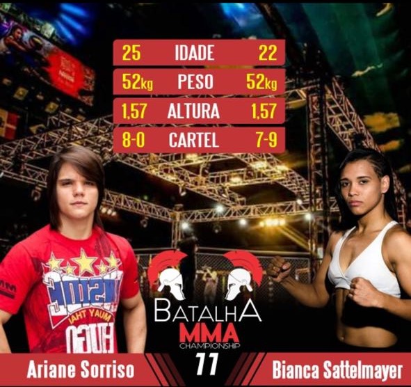 O Batalha MMA acontece no próximo dia 27, no Ginásio de Esportes Dr. Lourenço Quilici, o “Lourenção”, em Bragança Paulista/SP. Além da disputa de cinturão peso palha entre Ariane “Sorriso” e Bianca Sattelmayer, o evento também contará com outros bons nomes do MMA nacional, como o prospecto Anderson “Buzika” e o experiente Claudiere Freitas.