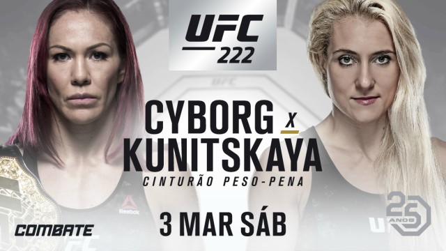 A brasileira Cris Cyborg já tem data e adversária para sua segunda defesa do cinturão peso-galo do Ultimate: será no dia 3 de março, contra a russa Yana Kunitskaya, na luta principal do UFC 222, em Las Vegas.