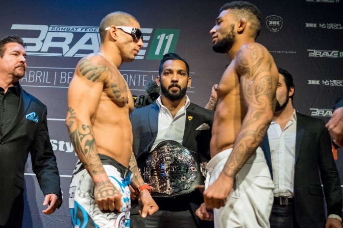 O Brave 11 teve sua pesagem cerimonial realizada nesta quinta-feira no Hotel Ouro Minas, em Belo Horizonte, cidade que também receberá a terceira edição brasileira do maior evento de MMA do Oriente Médio. Na luta principal, os brazucas Luan “Miau” Santiago e Lucas “Mineiro” Martins, que se enfrentarão pelo cinturão interino do peso leve da organização, fizeram uma encarada respeitosa.