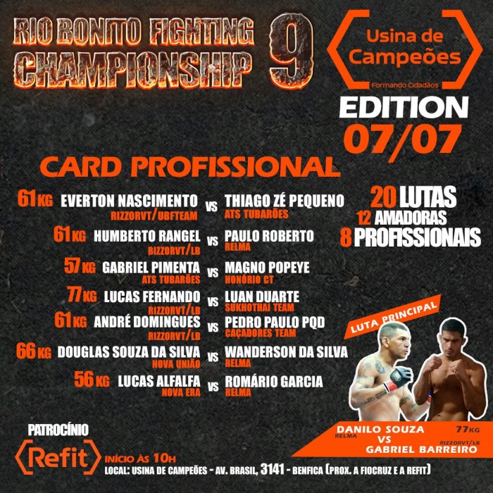 O RBFC (Rio Bonito Fight Championship) está chegando pela primeira vez à cidade do Rio de Janeiro, neste sábado (07), com a sua edição de número 9, e promete ser um dos maiores eventos da história da organização, esta edição conta com o apoio de peso da Usina de Campeões, projeto social da Refit – nova marca da Refinaria de Manguinhos. Com grande estrutura e com um card recheado de jovens talentos, o evento, que tem organização de Uanderson Brito e da lenda do MMA, Pedro Rizzo, promete parar o bairro de Benfica neste fim de semana.