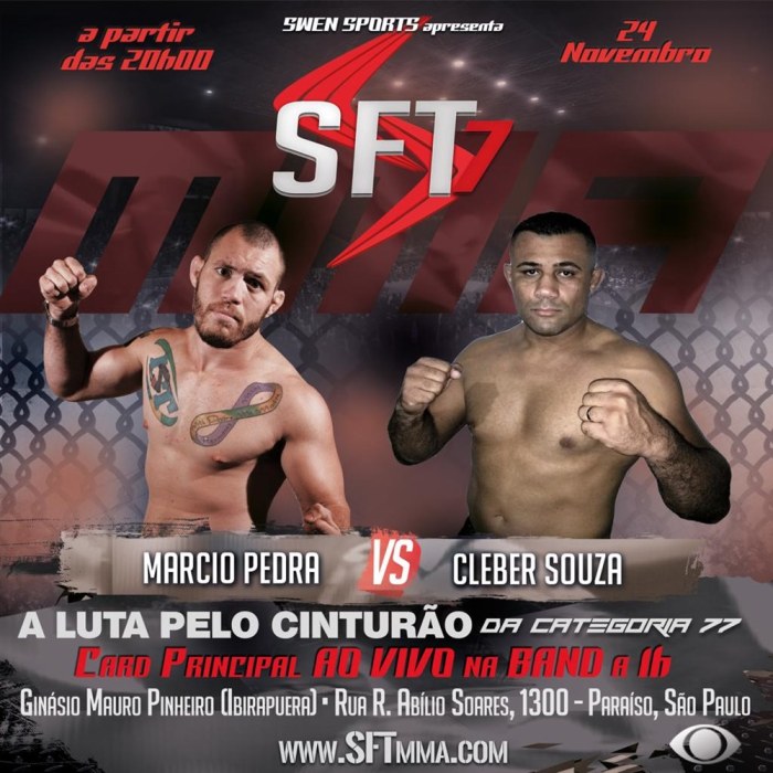 O Standout Fighting Tournament (SFT), principal evento de MMA do Brasil, está de volta para sua sétima edição, que será disputada neste sábado (24), a partir das 21h, no Ginásio Mauro Pinheiro, em São Paulo (SP). O evento vai colocar frente a frente dois dos maiores peso meio-médios (até 77kg) em atividade no cenário nacional: o campeão peso-médio (até 84kg) do SFT, Cléber Souza, e o ex-TUF Brasil Márcio Pedra. Os lutadores irão disputar o cinturão da categoria até 77kg.