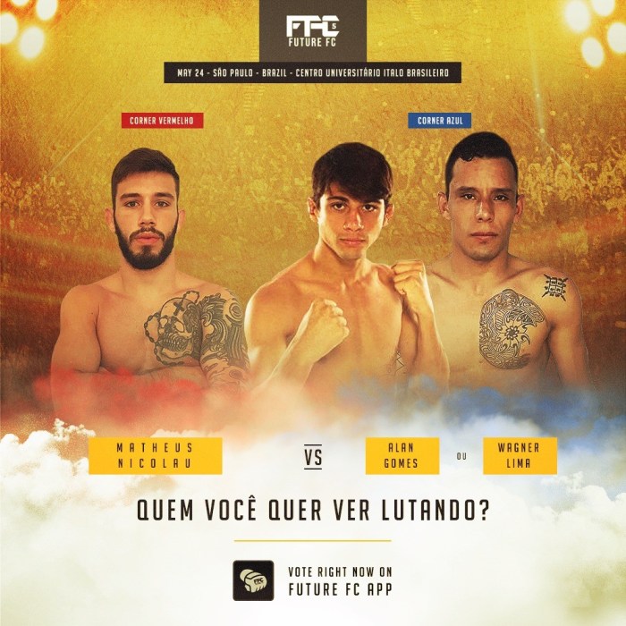 Integrante do ranking dos moscas do UFC até bem pouco tempo, Matheus Nicolau foi um dos que sofreu com o corte de atletas da categoria e, mesmo com o retrospecto de três vitórias em quatro lutas, não teve seu contrato renovado com a organização. Focado em retornar ao maior evento de MMA do mundo, ele decidiu subir para os galos, peso no qual obteve bons resultados no passado. Sua reestreia na divisão será nesta edição do Future, contra o vencedor da votação entre Alan Gomes e Wagner Lima.