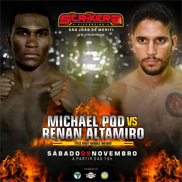 Já na luta principal, o confronto entre Renan Altamiro e Michael “PQD” Oliveira promete trocação e muita agressividade do início ao fim. Michael vem embalado por uma série de vitórias na seletivas do Strikers, Skaus e no próprio Skaus Combat vencendo o duríssimo Walber dos Anjos. Já do outro lado do ringue, Altamiro é um cara bastante experiente e com muita rodagem no cenário da trocação. Já conquistou inúmeros títulos dentro do Muaythai e só não conquistou o cinturão do Skaus Combat por ter falhado na pesagem oficial e vem para esse Strikers Kickboxing para coroar a transição entre Muaythai e Kickboxing.