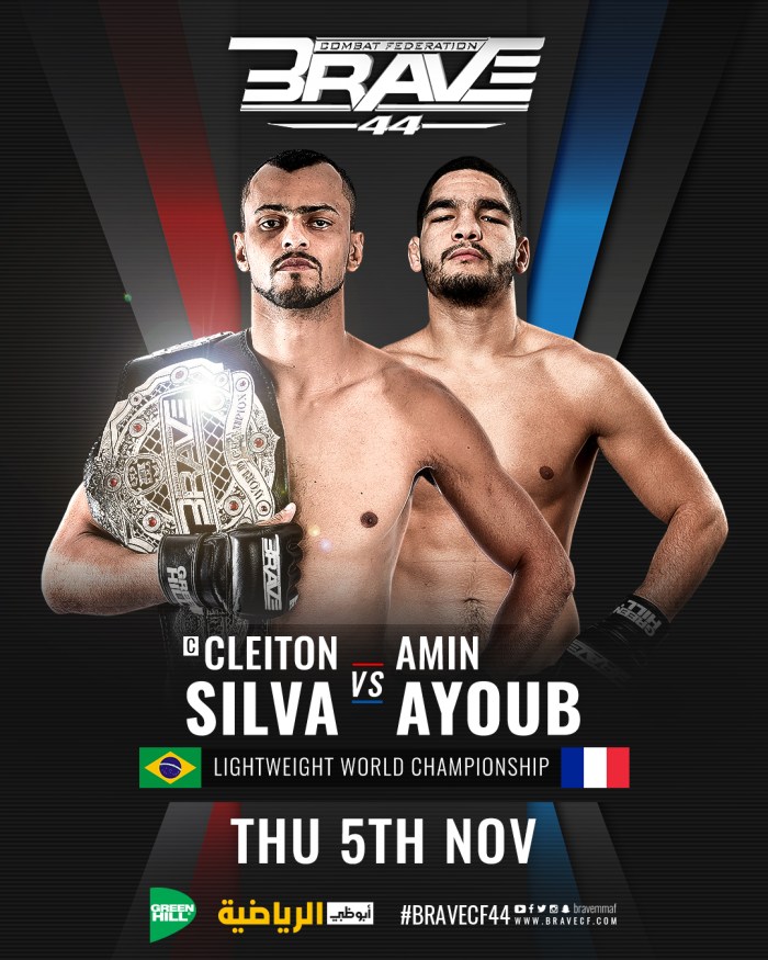 A organização de MMA que mais cresce mundo afora retorna à sua casa no Bahrein para dois eventos nos dia 5 e 12 de Novembro e terá presença brasileira no primeiro dos dois cards. No BRAVE CF 44, marcado para o dia 5 de Novembro, o campeão Cleiton ‘’Predador’’ Silva defenderá seu cinturão peso leve diante do franco-tunisiano Amin Ayoub na luta principal do show.