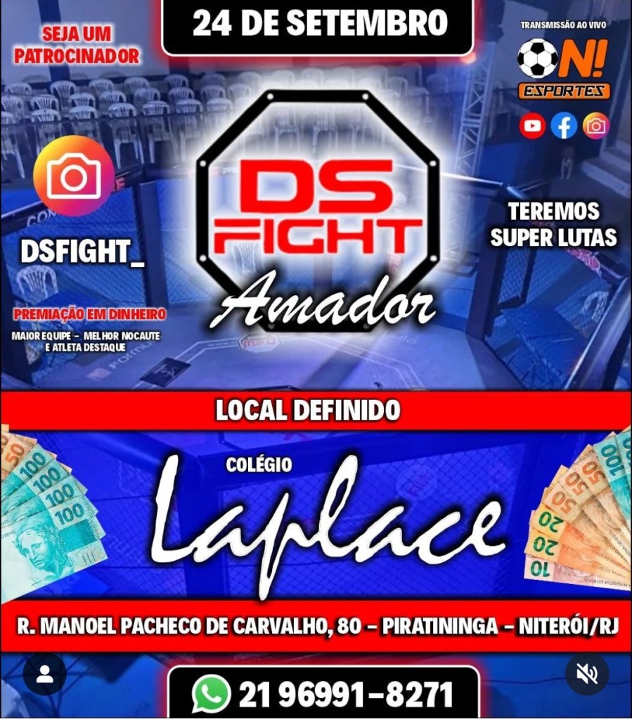 Lembrando que o evento será transmitido ao vivo pelo Youtube (Team Denison Silva) e também pelo instagram (@DsFight_), no domingo, dia 24 de setembro de 2023. Portanto, os fãs poderão acompanhar todas as lutas e torcer por seus lutadores favoritos. Será uma noite emocionante para os amantes das artes marciais mistas. O evento é idealizado pelo ex lutador Denison Silva e será realizado no Colégio Laplace em Piratininga, Niterói.