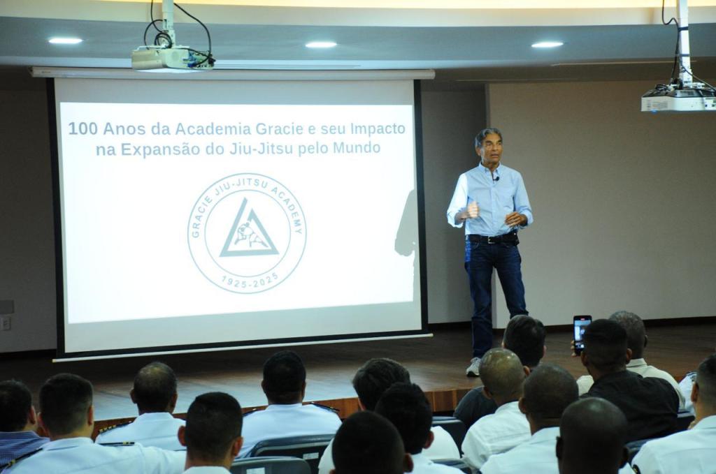 Com iniciativa do Comandante do CEFAN, Almirante Max, o encontro reuniu cerca de 100 praticantes da arte suave, incluindo jovens de projetos sociais, veteranos, militares, civis e alunos da Escola Naval. Um dos pontos altos da programação foi a exibição do documentário “100 Anos da Academia Gracie”, que emocionou os presentes ao retratar a trajetória da família que revolucionou o Jiu-Jitsu e ajudou a projetar o Brasil no cenário mundial da luta.