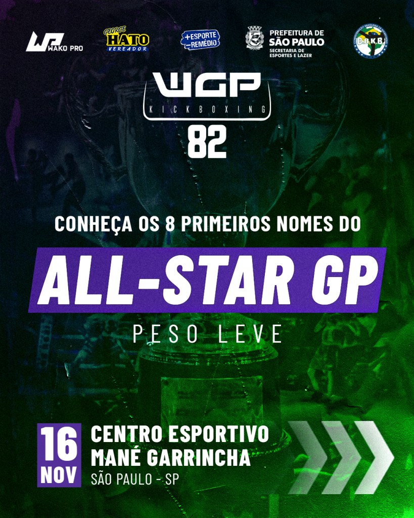 O maior evento de luta em pé da América Latina está de volta à capital paulista. No dia 16 de novembro, o WGP Kickboxing realiza sua 82ª edição no Centro Esportivo Mané Garrincha, em São Paulo, e promete uma noite histórica para os fãs da trocação. O grande destaque do evento será o All-Star GP dos Leves, um torneio especial que reúne os 16 melhores atletas da categoria até 60kg em busca do troféu e de um lugar de destaque no cenário continental. Toda a primeira fase do torneio, correspondente às oitavas de final, acontece nesta edição, enquanto as quartas de final, semifinais e a grande decisão estão marcadas para a última edição do ano, em dezembro. O GP contará com nomes de peso já confirmados como cabeças de chave. São eles: o atual campeão da divisão, Cabelo Monteiro (Brasil), além de Felipe Artillero (Chile), German Badallo (Argentina), Teodoro Ruiz Diaz (Paraguai) e os também brasileiros Fernando Mineiro, Edgar Boca, Francisco Mairon e Leandro Jobu. A organização ainda anunciará, nas próximas semanas, os oito atletas restantes que completam o torneio, bem como o chaveamento oficial dos confrontos.