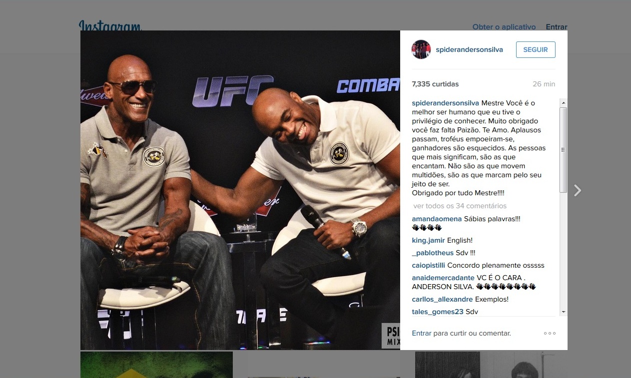 anderson silva Publicado em 8 de julho de 2015 as 1263 × 757 Nossa foto da coletiva de Anderson Silva postada no Instagram do atleta. COMPARTILHE NAS REDES SOCIAIS:Tweet Envie um link por e-mail para um amigo(abre em nova janela) E-mail Compartilhar em Vimeo(abre em nova janela) Vimeo Imprimir(abre em nova janela) Imprimir Compartilhar no Telegram(abre em nova janela) Telegram Compartilhar no WhatsApp(abre em nova janela) WhatsApp Curtir Carregando...